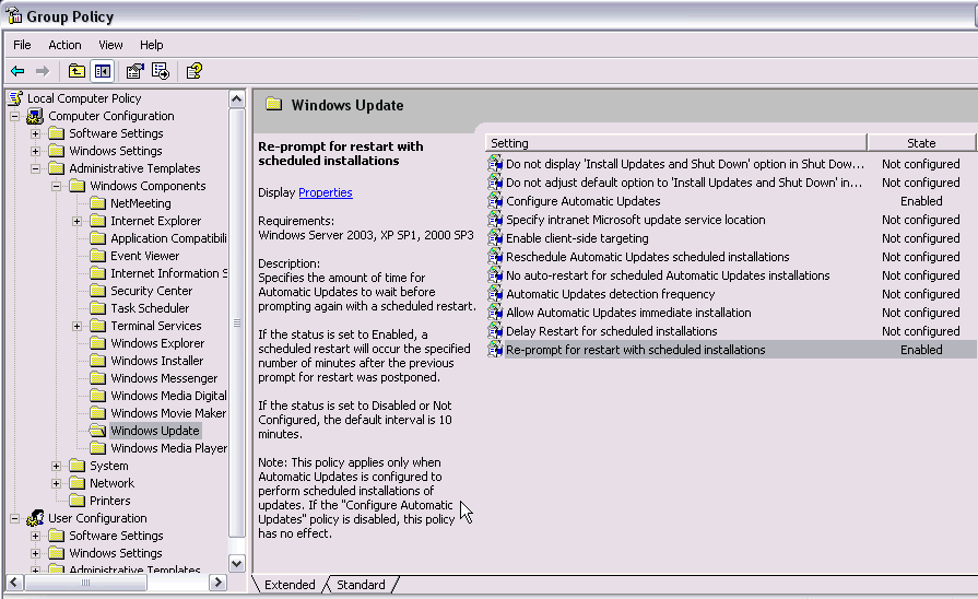Start -> Run -> gpedit.msc -> Local Computer Policy -> Computer Configuration -> Administrative Templates -> Windows Components -> Windows Update -> Re-prompt for restart with scheduled installations.